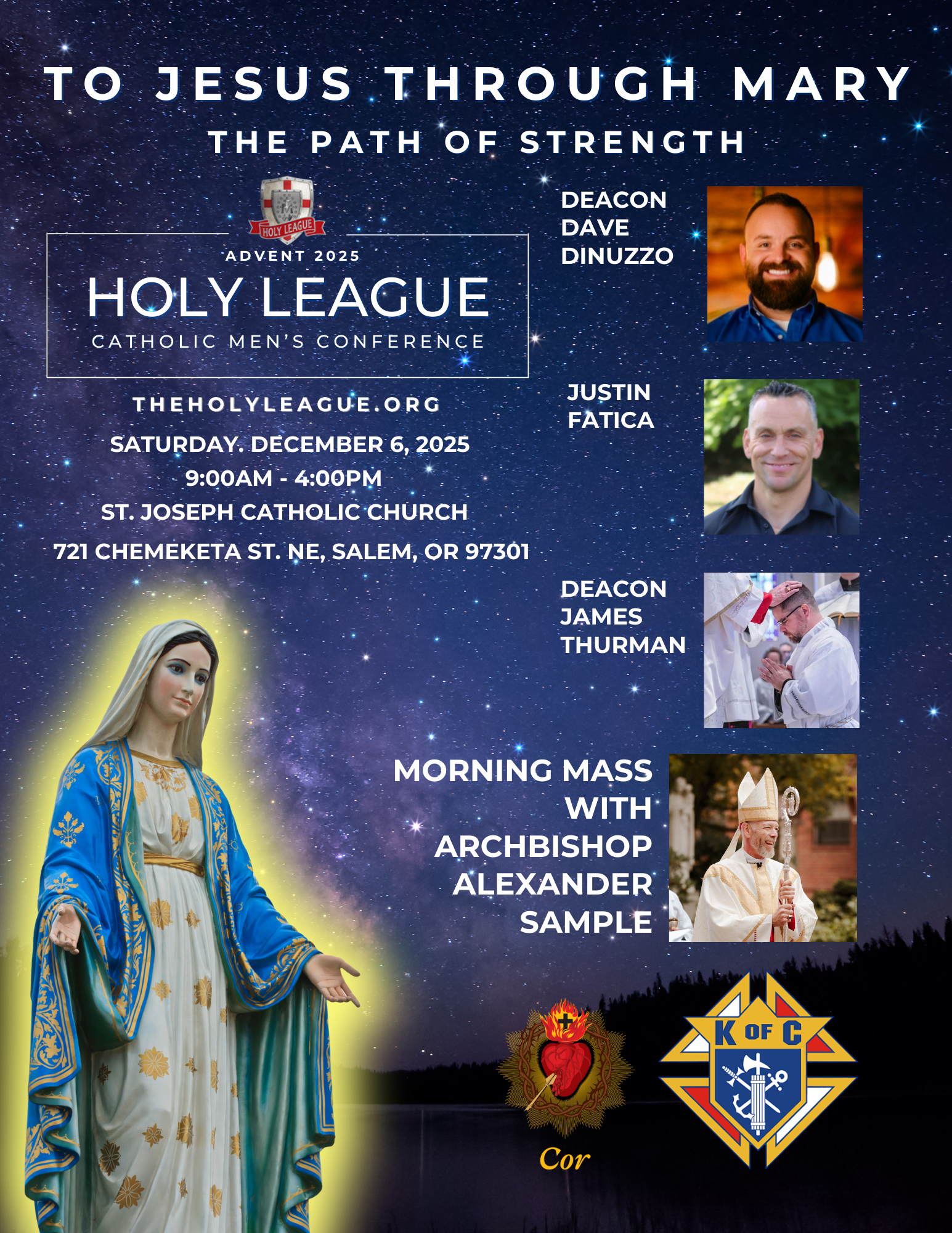 The Advent 2025 Holy League Catholic Men’s Conference will take place on Saturday, December 6, 2025, at St. Joseph Catholic Church in Salem, Oregon, featuring Mass with Archbishop Alexander Sample and speakers including Deacon James Thurman, Deacon Dave Dinuzzo, and Justin Fatica, under the theme “To Jesus Through Mary – The Path of Strength”.